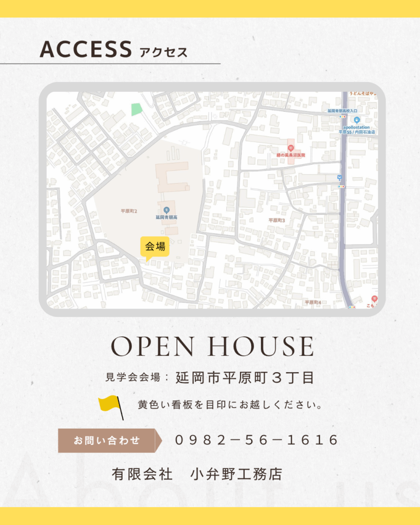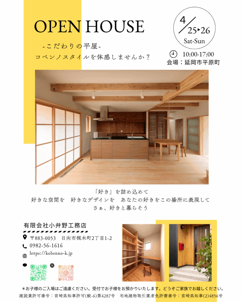 完成見学会のお知らせ 2026.04.18 最終更新日時 : 2026.04.18 user OPEN HOUSE-こだわりの平屋- 4月25日·26日(土·日)AM:10:00~PM:17:00会場:延岡市平原町3丁目お施主様の「好き」をたくさん詰め込んだコベンノスタイルの家が完成しました。 黄色い看板を目印にお越しくださいお子様のご入場はご遠慮いただいております。受付でお子様をお預かりいたしますのでどうぞご家族でお越しください。 お気軽にお問い合わせください☎0982-56-1616 #完成見学会#延岡市#新築#家づくり#小弁野工務店